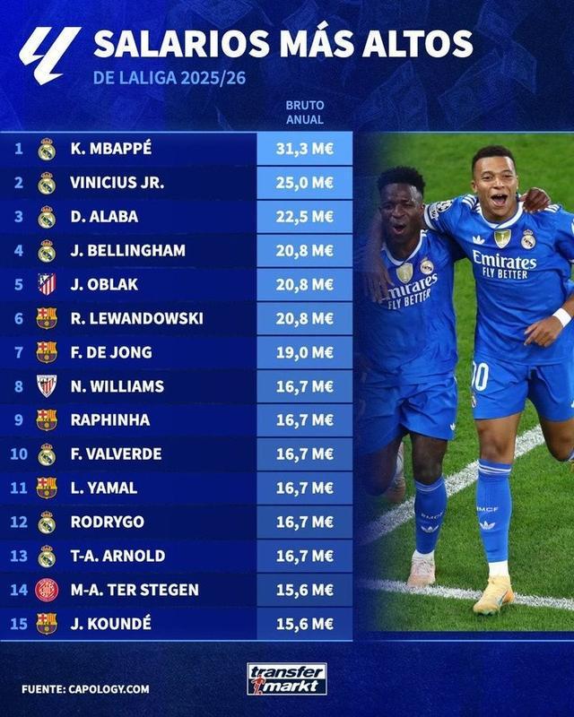 南宫NG28-德转列西甲球员年薪榜:姆巴佩3130万欧居首,皇马包揽前四